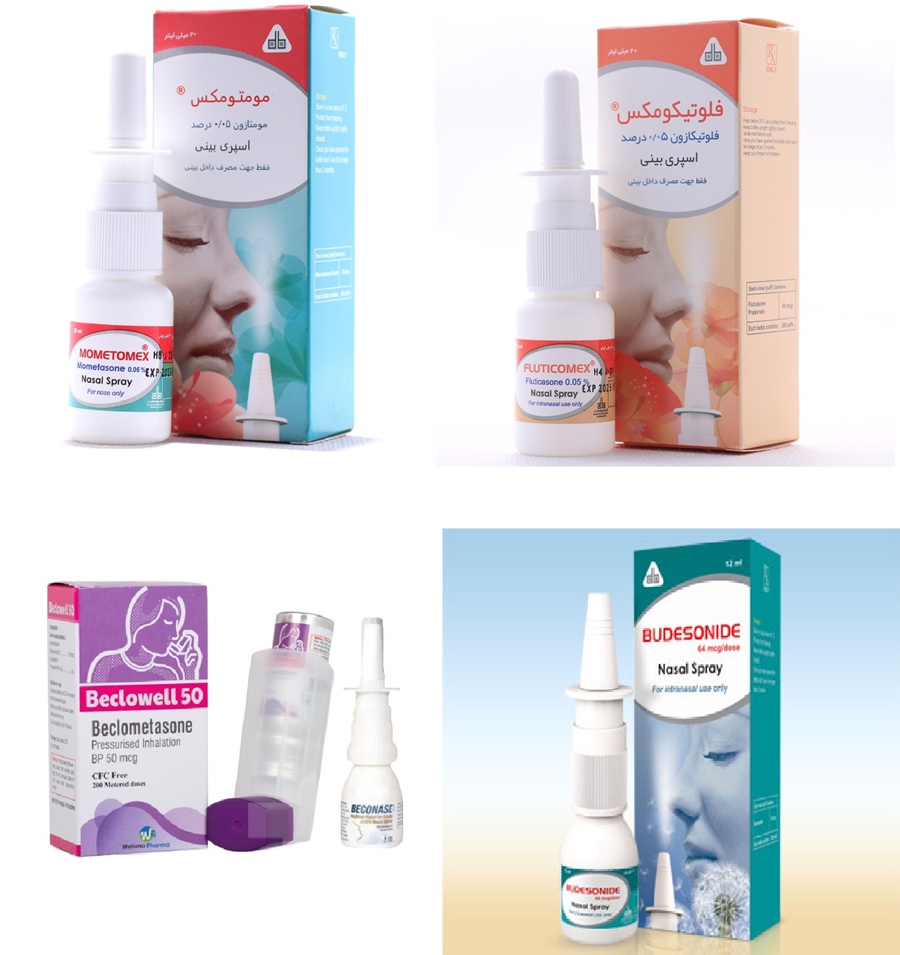 اسپری های کورتیکواستروئیدی بینی قویترین درمان رینیت آلرژیک می باشند و شامل انواع فلوتیکازون، مومتازون، بودزوناید، بکلومتازون و … می باشند. این داروها بخوبی روی احتقای بینی، خارش و آبریزش بینی موثرند ولی اثرات کمی روی علائم چشمی بیماری دارند. بعلت جذب جزئی عوارضی سیستمیک ندارند ولی دراسپری های طولانی مدت به تیغه میانی بینی می توانند باعث خون دماغ گردند بنابراین این داروها نباید به تیغه وسط بینی بلکه به دیواره های طرفی بینی اسپری گردند.