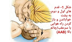 - با یک دست با فشار بر پیشانی سر را عقب برده و انگشت اشاره دیگر را زیر چانه انداخته و چانه را بالا میکشیم تا راه هوايى باز شود (شکل 1).