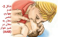 وگرنه با قدم 4 تنفس دهان به دهان می دهیم و اگر بازهم باز نشد قدم پنجم که ضربه به پشت/ فشار بر قفسه سینه است را انجام میدهیم، و این توالی ذکر شده ( قدم 1 تا 5) تا رسیدن اورژانس به شیر خوار یا رساندن وی به اورژانس بیمارستان باید تکرار شود .