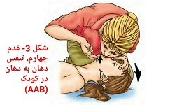 - با حفظ وضعیت گفته شده (سرعقب /چانه بالا) در حالیکه با انگشت شست و نشانه همان دستی که سر را عقب دادیم بینی کودک را میبندیم، ۵ بار تنفس دهان به دهان می دهیم (شکل 2 و 3).