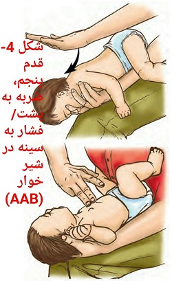 شيرخوار را رو به شکم روی ساعد یک دست می گذاریم. در حالتی که خود دست روی ران قراردارد و صورت شیر خوار روی انگشتان دست است و شیب رو به پایین دارد. ابتدا ۵ ضربه با کف دست دیگر به پشتش زده و سپس شیر خوار را می چرخانیم و در حالیکه پشتش روی ساعد است و پشت سرش در کف دست قرار دارد و به سمت پایین شیی دارد، ۵ بار قفسهی سینه اش را با گذاشتن انگشت حلقه و وسط روی جناغ سینه اش فشار می دهیم (شکل۴ ).